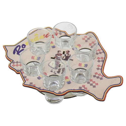 Suport din lemn Harta Romaniei cu 6 pahare avand motine traditionale romanesti.